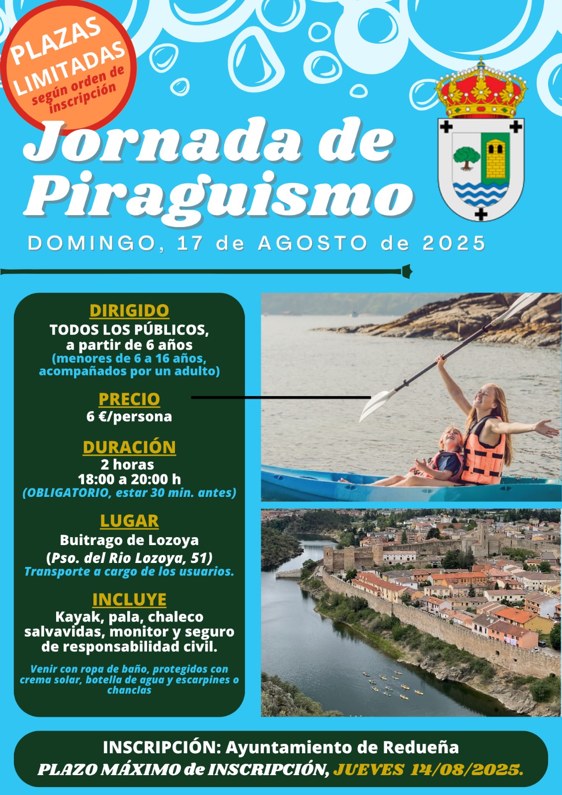 El domingo 17 de agosto de 2025 se llevará a cabo una jornada de piragüismo en Buitrago de Lozoya. La actividad está dirigida a todos los públicos a partir de los seis años.
