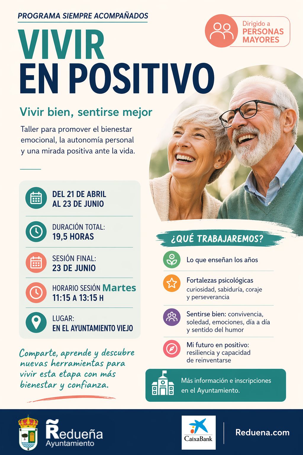 Con esta iniciativa, el Ayuntamiento refuerza su compromiso con las personas mayores y con la promoción de un envejecimiento activo, saludable y acompañado. “Vivir en positivo” no es únicamente un taller formativo: es un espacio de encuentro, escucha y participación donde compartir experiencias, fortalecer vínculos y descubrir nuevas herramientas para afrontar la vida cotidiana.