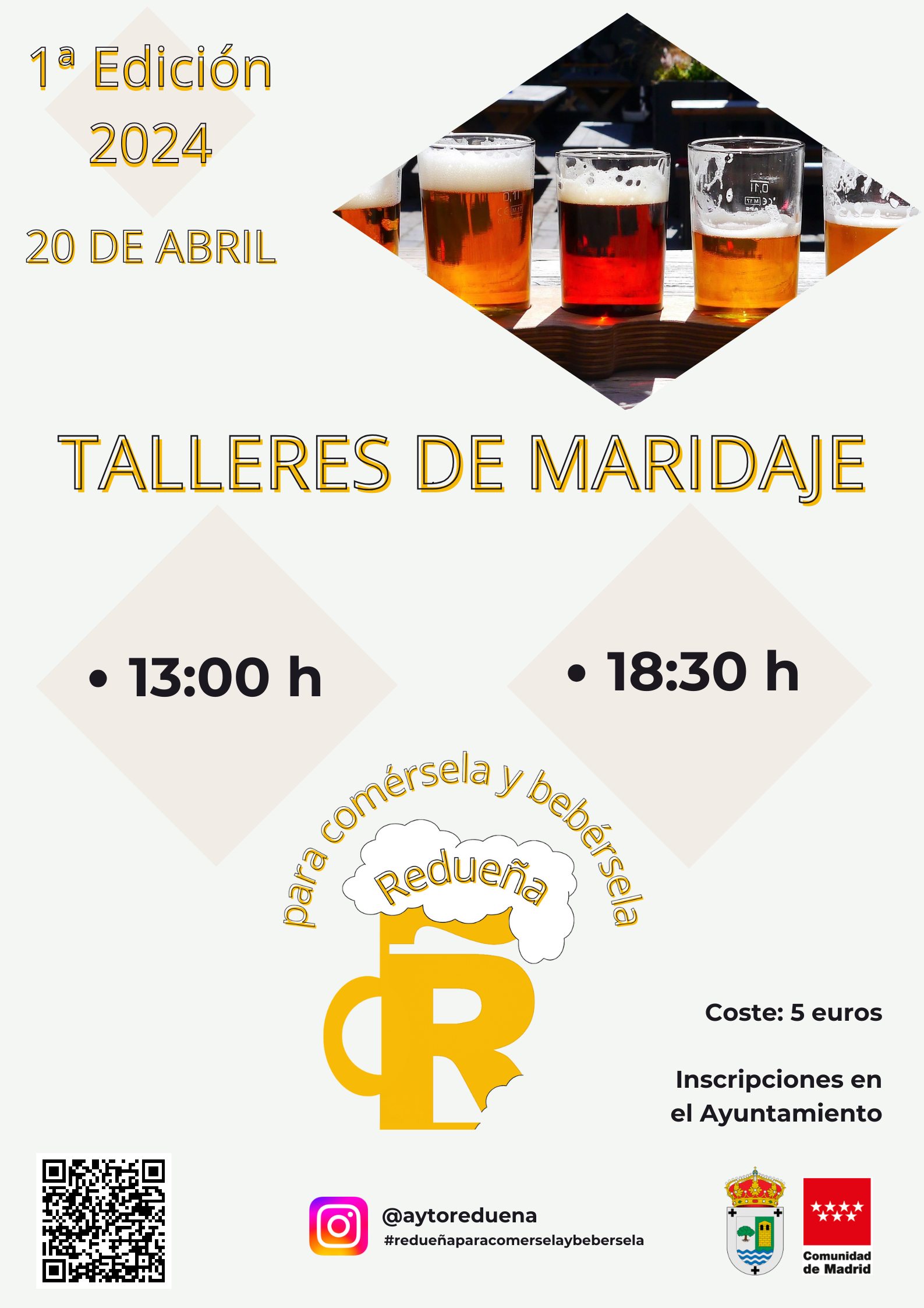 Continuamos con los preparativos de la primera edición de la Feria «Redueña para Comérsela y Bebérsela», que tendrá lugar el sábado 20 de abril. Una vez dada a conocer la programación, invitamos a los vecinos y a todas las personas que lo deseen a apuntarse a los talleres de maridaje o catas que se celebrarán durante la jornada.