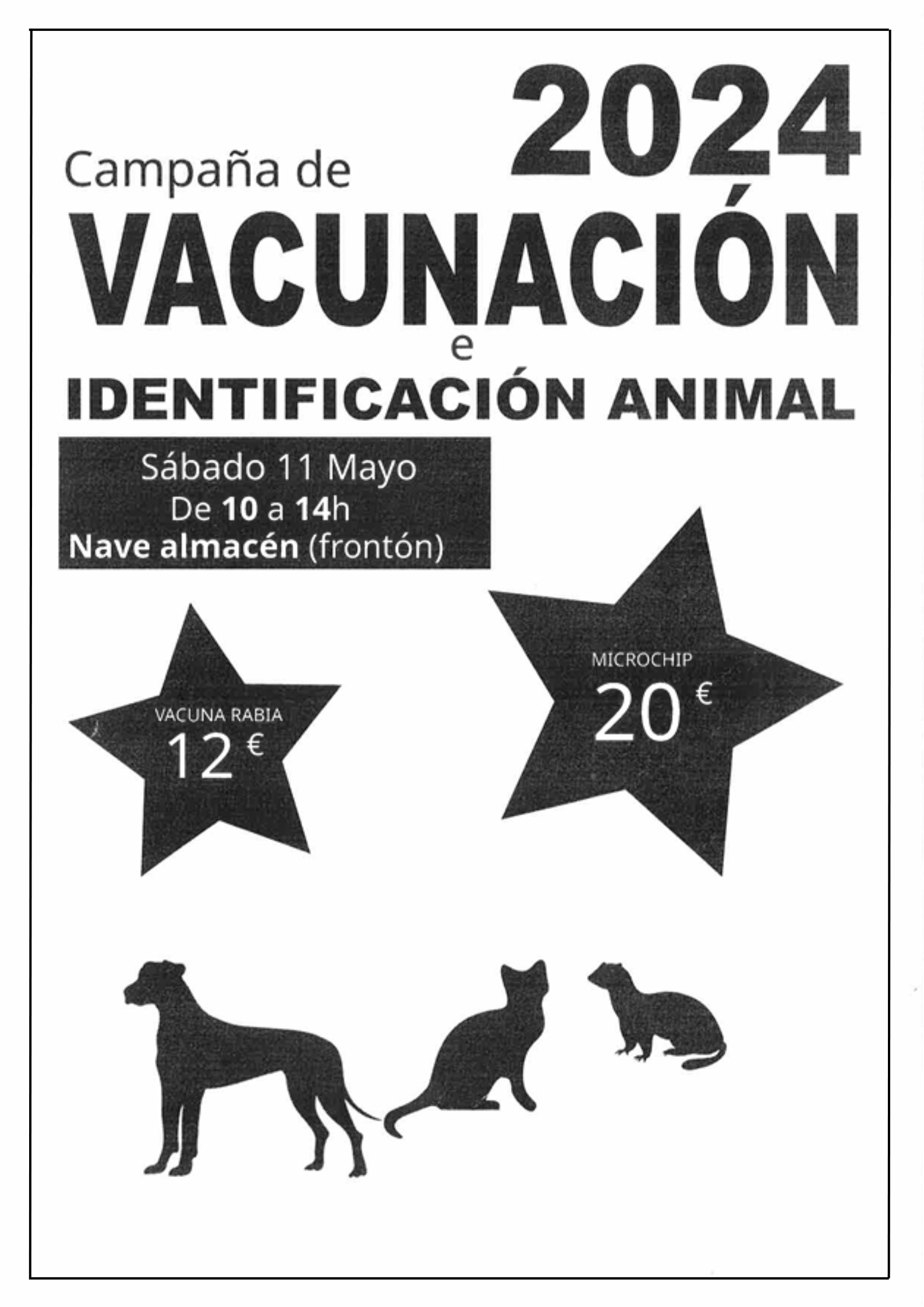 El sábado 11 de mayo de 2024, de 10:00 a 14:00 h, te esperamos en la Nave Almacén (frontón) para ofrecerte los servicios de vacuna antirrábica y microchip para tu mascota.